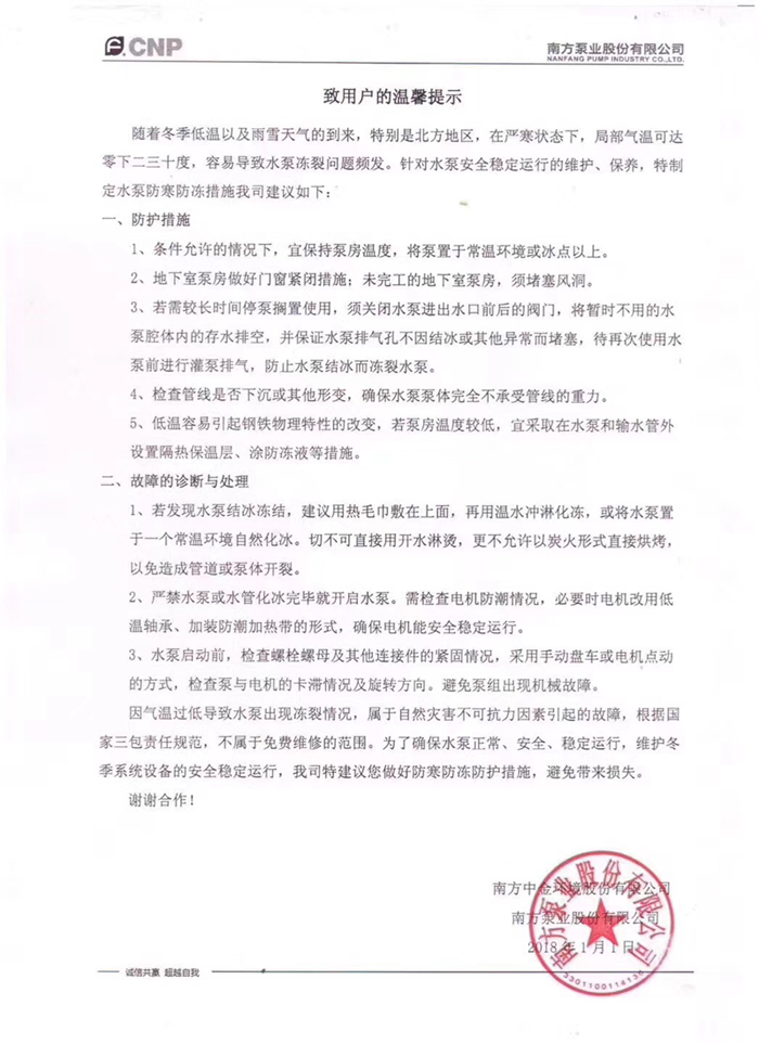 昆山卡尼爾主要銷售南方泵業(yè)股份有限公司的離心泵、污水泵、水泵配件等,最近溫度降低,水泵也需要防凍,下面就來看看杭州南方水泵給大家的一些建議如下: