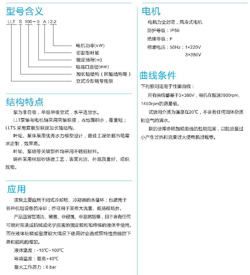 LLT、LLTS泵為非自吸,單級單吸立式,水平進出水。LLT泵軸與電機軸采用同軸聯(lián)接,占地面積小,重量輕;LLTS采用直聯(lián)型聯(lián)接加長軸結(jié)構(gòu)。,葉輪、泵體采用優(yōu)秀水力模型設(shè)計,依據(jù)市場需求定制,效率高。