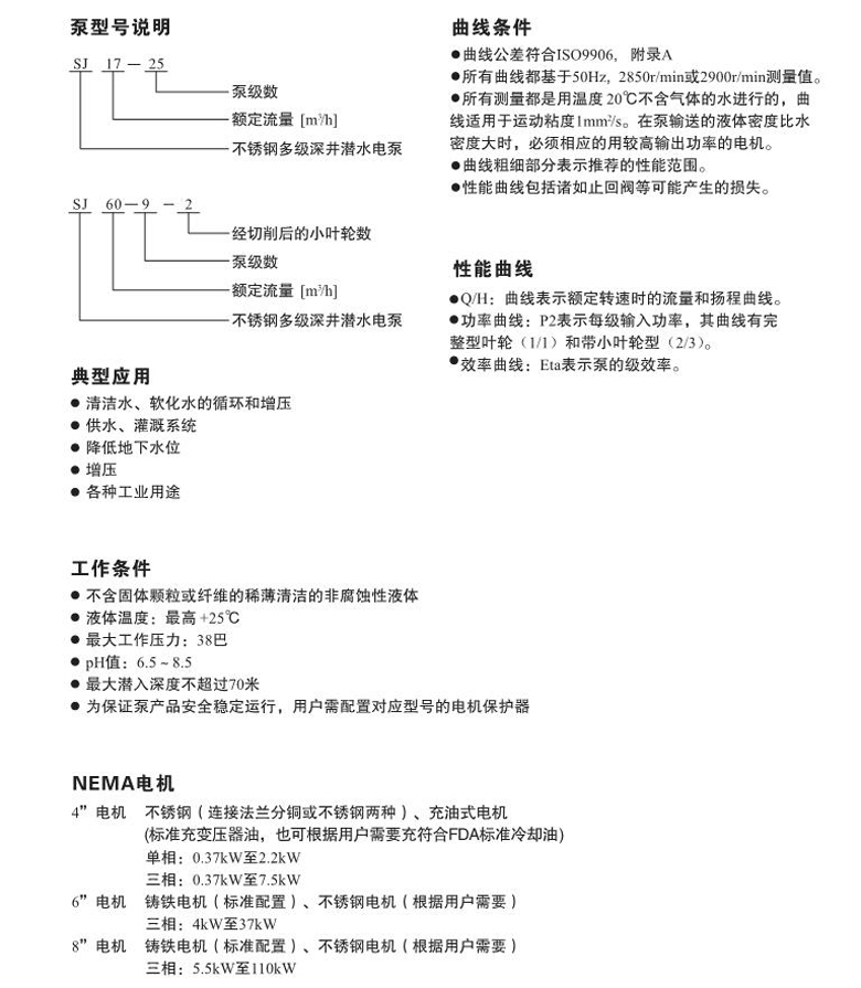 南方SJ不銹鋼多級(jí)深井潛水電泵配用潛水電機(jī),替代傳統(tǒng)長軸式聯(lián)接的深井泵,泵內(nèi)裝有止回閥,以防止停機(jī)逆流及管路水錘對(duì)泵的沖擊。